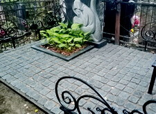 На представленных ниже фотографиях состояние места захоронения на момент прихода клиента. Брусчатка положена, форма цветника и вид оградки изменены. Работа над этим объектом – яркий пример того, как сильно может повлиять на внешний вид участка лишь одно наземное покрытие.